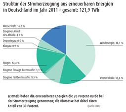 (21.03.2012) Bei der Stromerzeugung konnten die erneuerbaren Energien geradezu sprunghaft zulegen und kommen nun auf einen Anteil von 20,1 Prozent im Jahr 2011. Im Jahr 2010 waren es noch 17,1 Prozent. Dazu haben vor allem die stärkere Nutzung von Windenergie und Biogas sowie der kräftig gestiegene Solarstromanteil beigetragen. Allein die Nutzung der Windenergie trug 2011 mit 7,7 Prozent zur Stromversorgung bei (2010: 6,2 Prozent), der Anteil der Biomasse betrug rund 6 Prozent (2010: 5,5 Prozent), Wasserkraft rund 3,2 Prozent (2010: 3,4 Prozent) sowie die Solarenergie rund 3,1 Prozent (2010: 1,9 Prozent)...